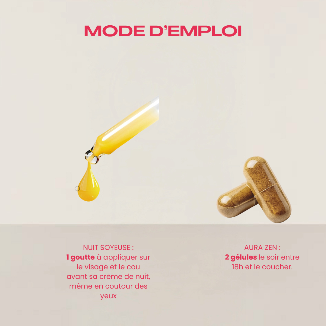 Grâce à la complémentarité des actifs de Aura Zen et Nuit Soyeuse, vous allez avoir un rayon d'action et sur votre mental et sur votre peau :